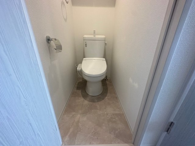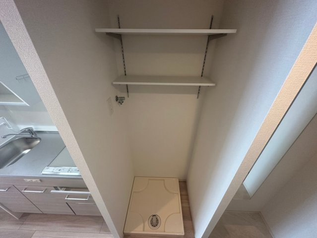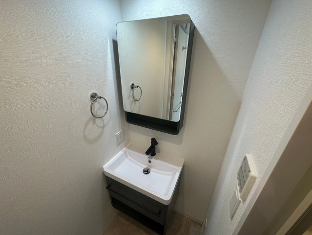ブラックカラーのスタイリッシュな独立洗面台が印象的な水回りは、毎日の身支度も気分よくこなせる空間です。浴室には浴室乾燥機付きで、雨の日でも洗濯物を乾かしやすく快適さをプラスします。玄関すぐの廊下に独立した室内洗濯機置き場があり、上部の可動式棚でランドリー用品の収納も自由自在。人気のバストイレ別設計で、トイレはブラウン系の床で統一感のある落ち着いた印象です。