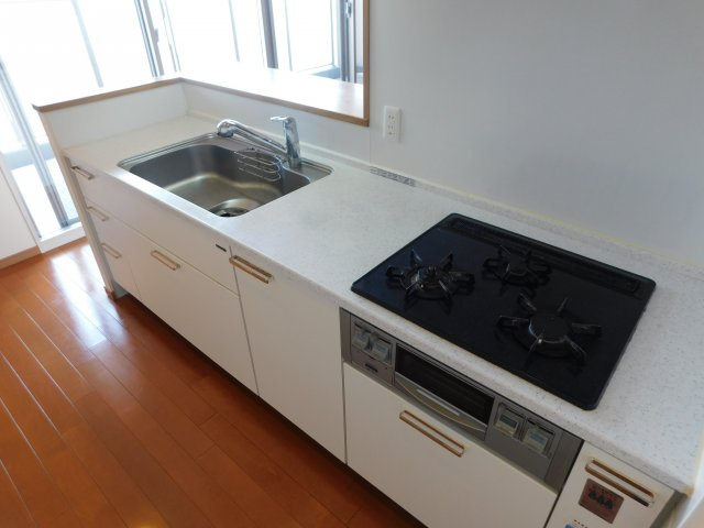 カウンターキッチンを採用した住まいは、リビングを見渡しながら調理ができ、家族との会話や見守りがしやすい点が魅力です。幅にゆとりのある設計で調理スペースもしっかり確保され、下ごしらえや複数人での調理も快適。ガス3口コンロに加えグリル付きのため、焼き物や魚料理も手軽に楽しめ、調理の幅が広がります。
