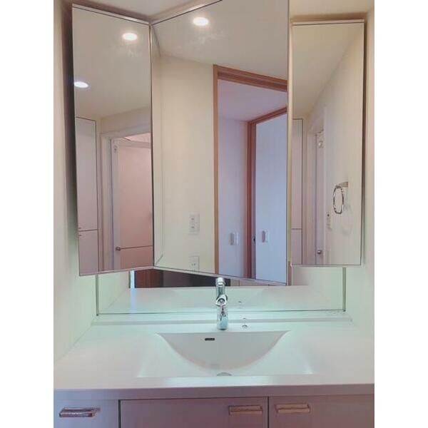 独立洗面台とウォシュレット付きトイレを備えた水回りは、毎日の使いやすさと清潔感が魅力です。三面鏡収納付きの独立洗面台は、化粧品や日用品をすっきり整理でき、洗面ボウルの両サイドには物を置けるスペースも確保。凹凸の少ないデザインで汚れがたまりにくく、掃除がしやすい点も嬉しいポイントです。