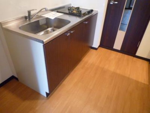 広めのシンクで洗い物がしやすく、上部には収納棚を完備。調理器具や食器もすっきり片付きます。