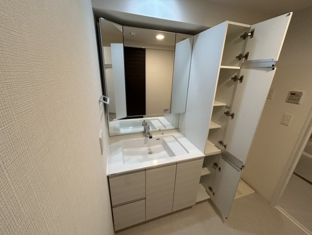 清潔感のあるウォシュレット付きトイレは使い心地が良く、来客時も安心です。三面鏡タイプの独立洗面台は収納力が高く、洗面まわりをすっきり保てるのが魅力です。