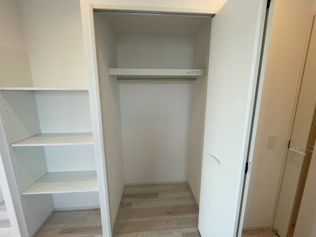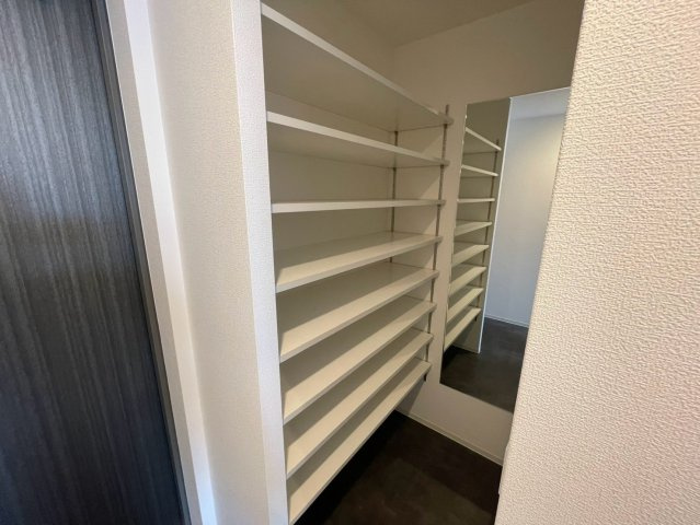 扉のないオープンタイプのシューズインクローゼットは、靴の出し入れがスムーズで珍しいデザイン。廊下にもクローゼットがあり、棚も完備されているため、日用品や季節用品まで整理しやすく、収納力が充実した住まいです。