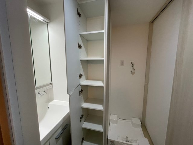 さらに洗面スペースやキッチン周りにも収納を確保しており、生活動線に配慮した使いやすい設計です。