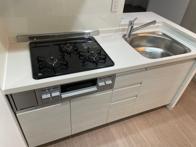 開放感のあるカウンターキッチンを採用し、料理をしながらリビングの様子を見渡せる設計。3口ガスコンロ付きで、同時調理もしやすく自炊派の方に最適です。