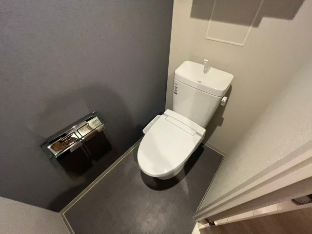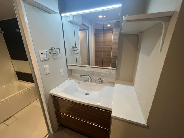 3面鏡収納付きの独立洗面台は幅広設計で、身支度がスムーズ。ミラー裏の収納で洗面まわりもすっきり整理できます。ウォシュレット付きトイレはダークグレーのクロスで落ち着いた空間に。清潔感とデザイン性を両立した水回りです。