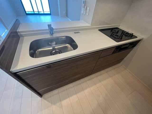 ガス3口コンロのカウンターキッチンは、ワイドな調理スペースで下ごしらえや盛り付けもスムーズ。ホワイト天板で空間が明るくなり、リビングとの一体感も演出。料理をしながら家族やゲストと会話を楽しめる設計です。