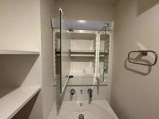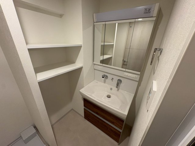 収納付き3面鏡の独立洗面台で、朝の身支度もスムーズ。ワイドな洗面ボウルは水はねしにくく、シャワー付き水栓で掃除や洗髪もラクにできます。小物もすっきり片付き、生活感を抑えた使いやすい空間に。