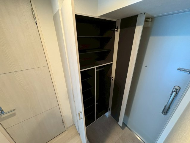玄関には大型シューズボックスを設置。靴はもちろん、傘や小物もまとめて収納でき、生活感を抑えたスマートな玄関に。