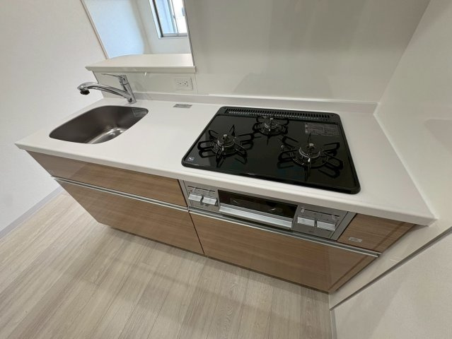 ガス3口コンロを備えた広め設計のシステムキッチン。カウンターキッチン仕様で、リビングと自然につながる開放的な空間が魅力です。3口コンロに加え、十分な作業スペースが確保されており、本格的に料理を楽しみたい方にも最適です。