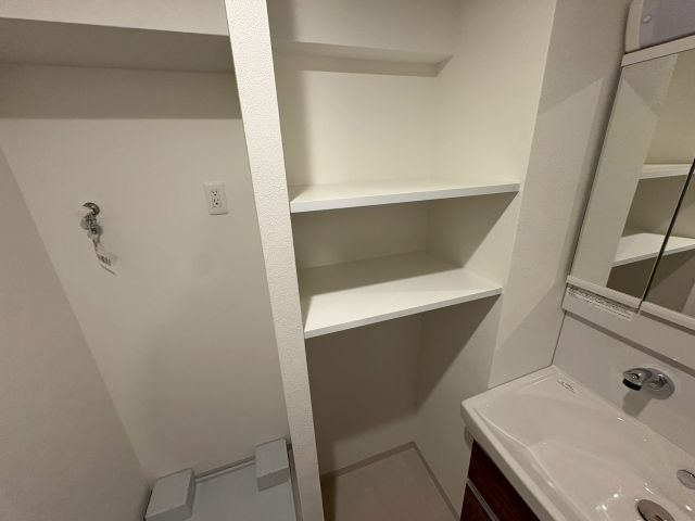 水回りにはオープンな収納棚を備え、タオルや洗剤類の出し入れもスムーズです。