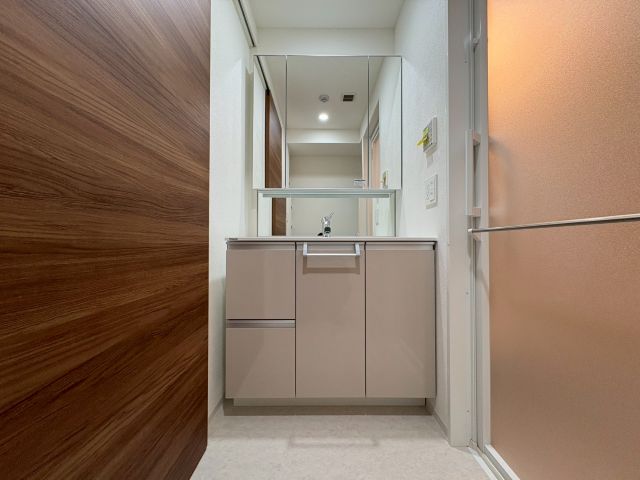 独立洗面台は三面鏡収納付きで、身支度や整理整頓がスムーズ。